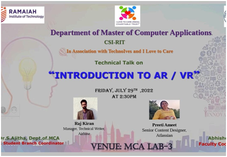 On July 29, 2022, Ms. Preeti Savanur and Mr. Raj Kiran conducted a session on Augmented Reality & Virtual Reality to the students of Computer Science at Ramaiah Institute of Technology. This session was a teaser to encourage students to be aware of how AR/VR could help in future.This project came under UNSDG 4 (Quality Education) of UNSDGs.