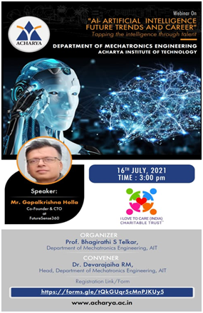 A seminar on Artificial Intelligence – Future Trends and Careers was conducted by Gopalkrishna Holla, Co-Founder & CTO at FutureSense 360, on July 16, 2021 for students of Acharya Institute of Technology, Bengaluru. Students gained deep knowledge on Artificial Intelligence with practical examples and its future prospects in alignment with their fields of study. This project came under UNSDG 4 (Quality Education) of UNSDGs.